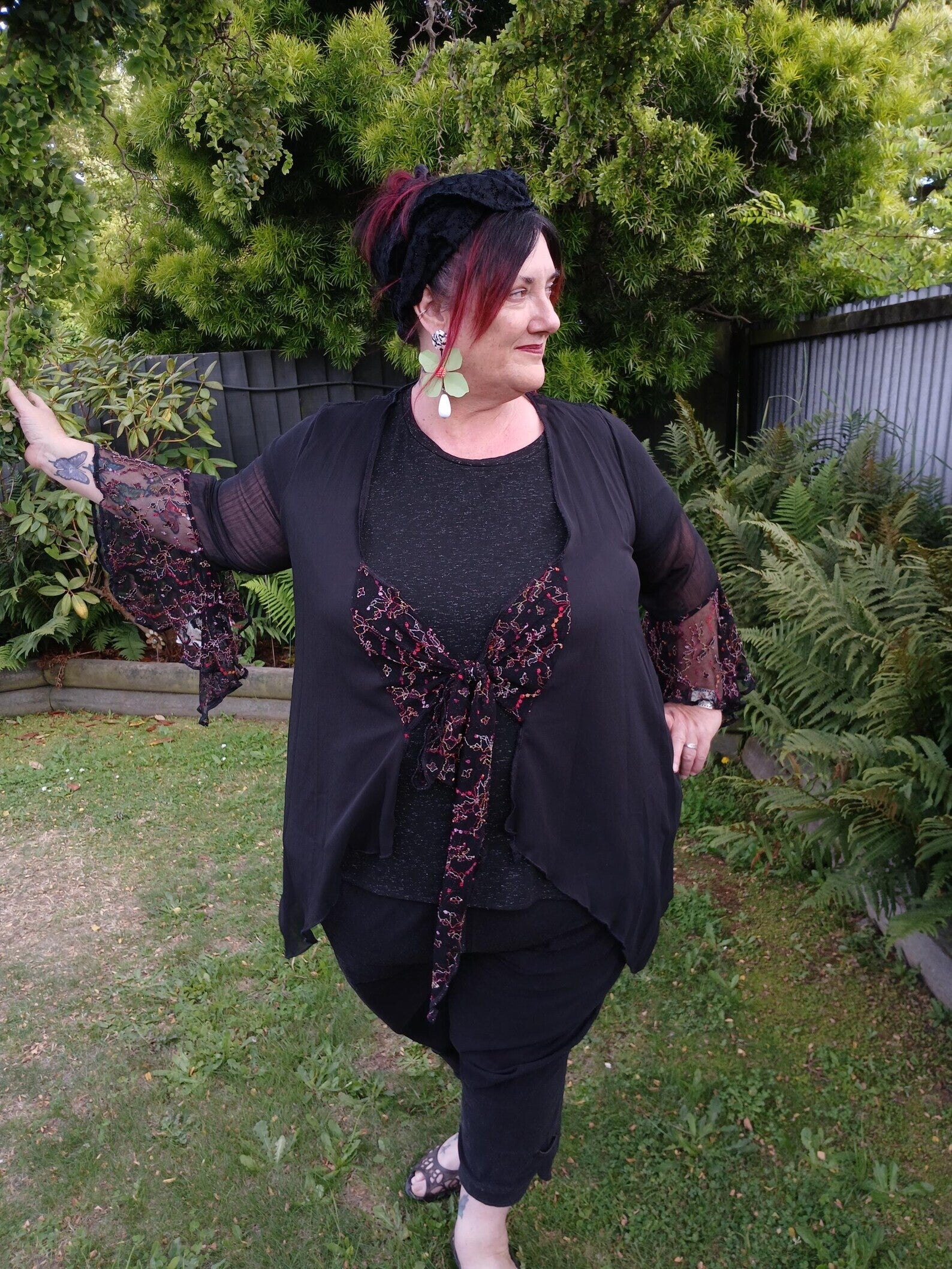 Baggy Lace crepe tie jacket. Nice and long to cover the bum.