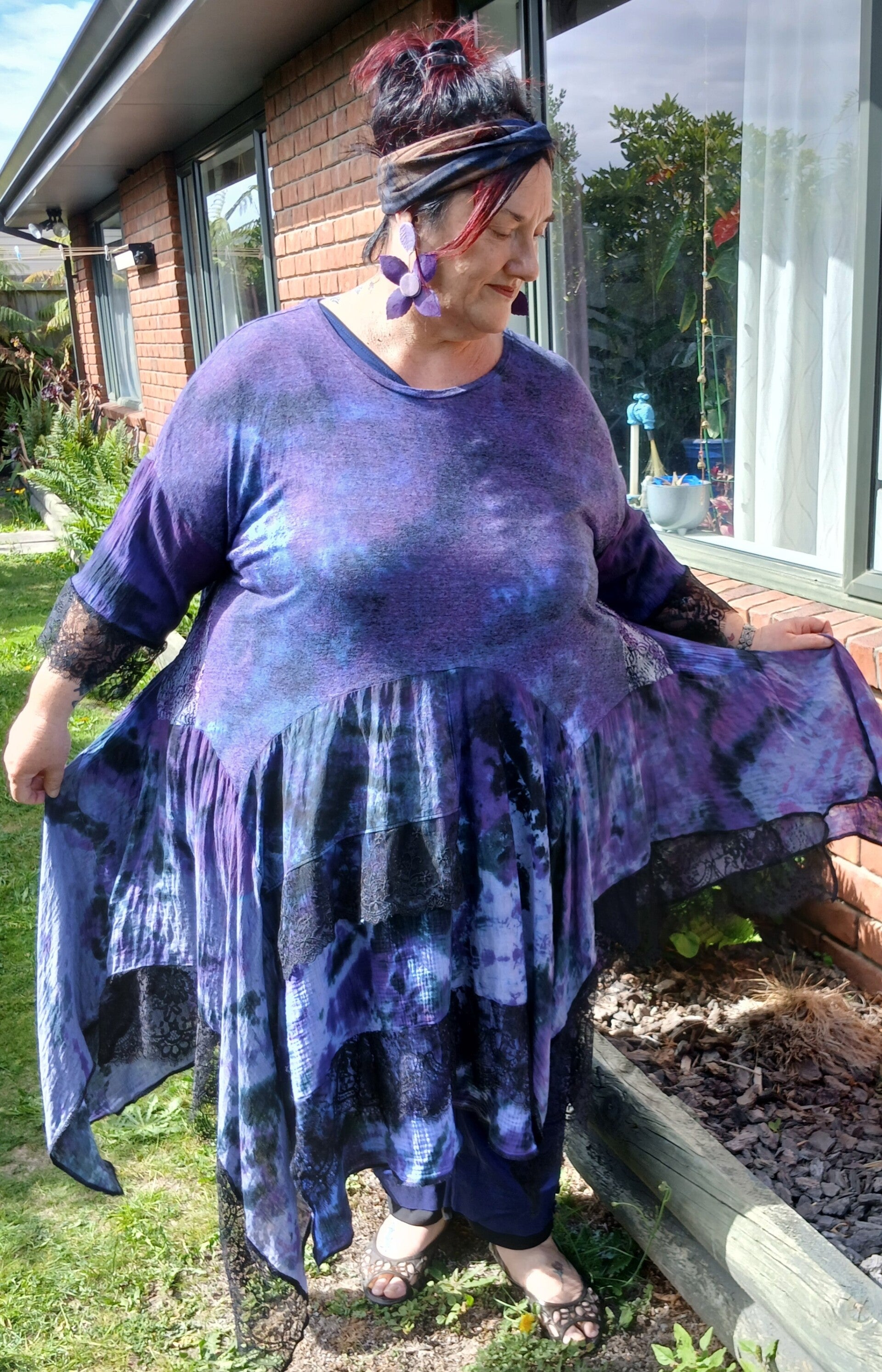 Long sleeve Tee size 4XLrg. Joined to flowing muslin, cotton, lace, panels. Color purple and blue.