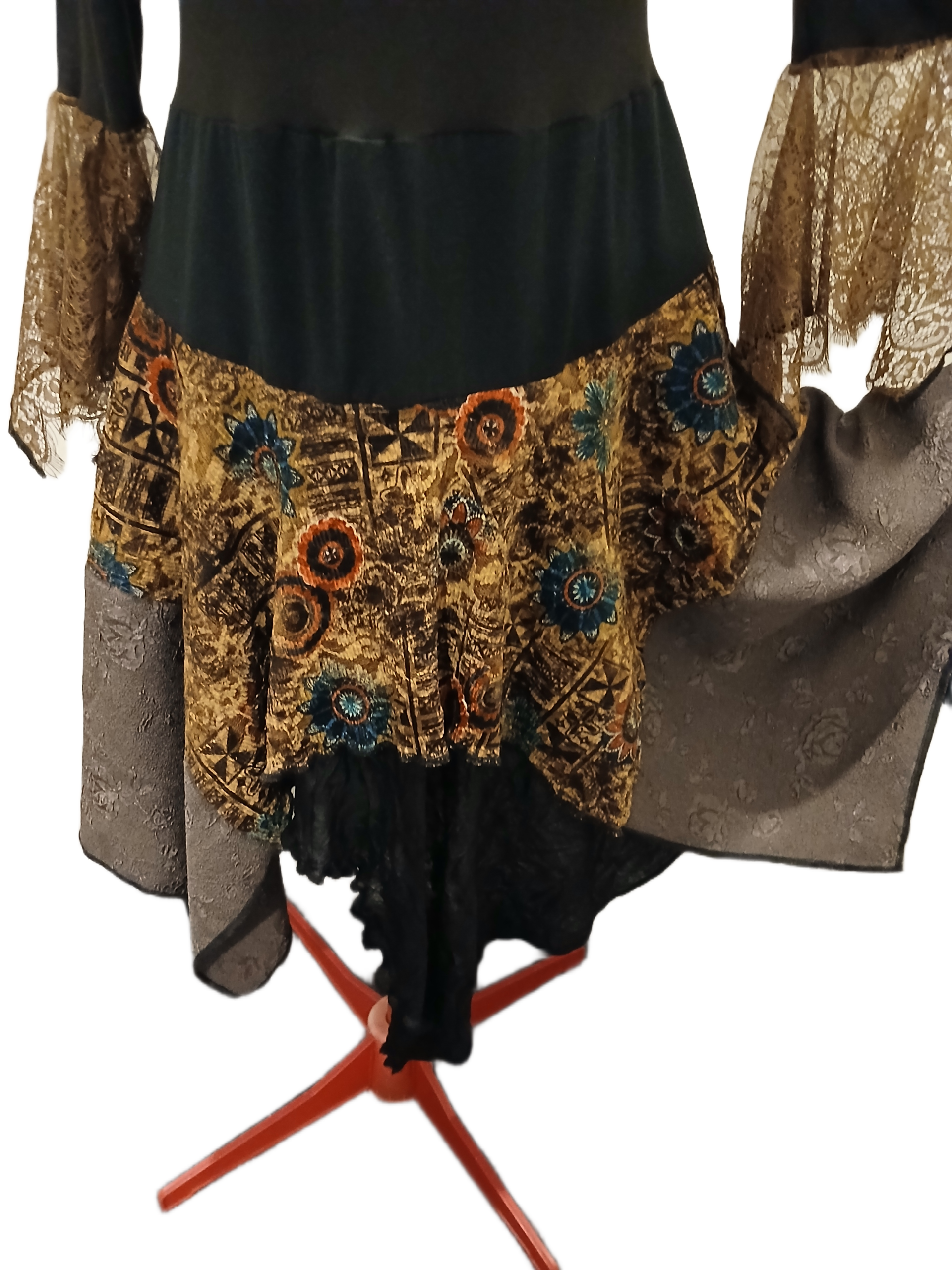 Joined to flowing hanky of patterned fabric panels with a black crepe underlay hanky. (2 Layers)
