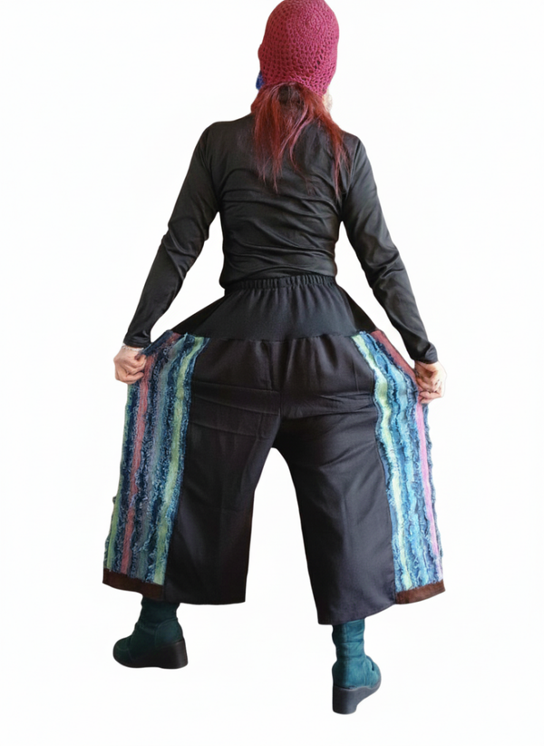 Jigsaw wide pants nice and baggy with an elastic waist and cord. So will fit a variety of sizes.
