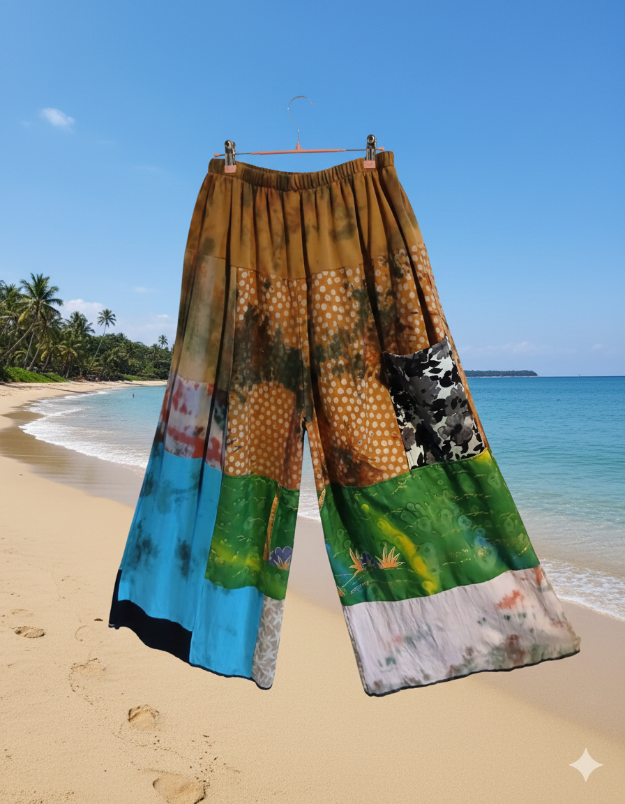 I love making these one of a kind puzzle pants with light weight fabrics. They fit a variety of sizes as stretch elastic on a stretch knit bodice.