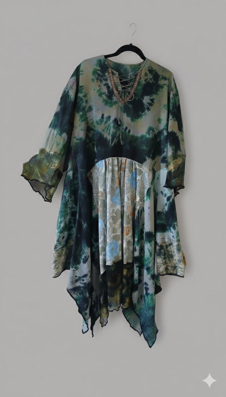 I import different tops then work my magic adding lace, cotton and muslin to the shaped bodice. I then tie dye the entire garment.