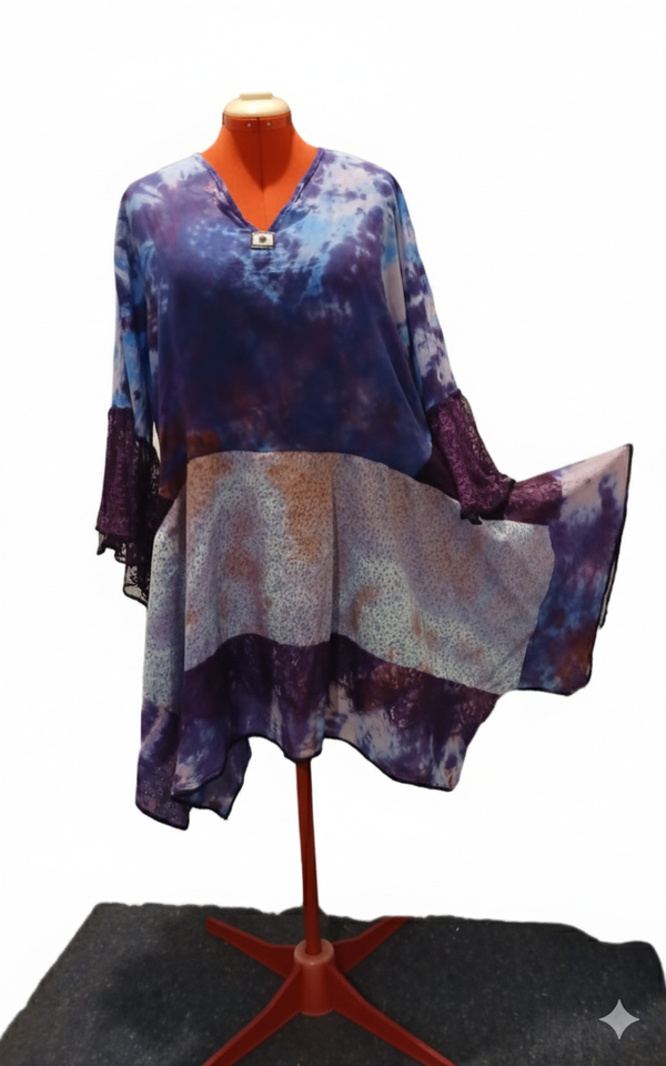 One left in the purple blue blend. Pattern cotton tie dyed with lace trim